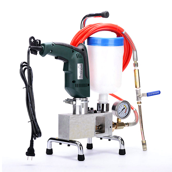 新机刚使用时,请先将润滑油倒入机器料杯内开启电源回圈一遍。机身及周边配备用软布沾润滑油擦拭一遍,将PU发泡剂或环氧树脂搅拌均匀倒入杯内,盖紧杯盖。灌注开关阀扳到open开启状态,灌注牛油嘴对准垃圾桶,开启电源开关,将管内剩余润滑油挤出到药剂喷出为止,先关闭电源开关,再关闭灌注开关阀。将灌注牛油嘴对准灌注头用力插紧、扶正,先开连接杆开关,再开启电源开关,将药剂持续增压注入结构体内,药剂从表面溢出为止,先关闭电源开关,再关闭连接杆开关,开关阀上下左右摆动松脱拔出。施工完毕必须马上以专用清洗剂倒入本机料杯内,将管内剩余药剂挤出到清洗剂喷出为止,灌注开关插入杯内,开关阀连续开关数次,使管内壁产生压力,容易清洗干净,清洗约3~5分钟后,将机器内清洗剂喷于垃圾桶内,喷完后,再用润滑油倒入灌浆机料杯内回圈、保养,避免药剂残留机器管壁内,导致堵塞。