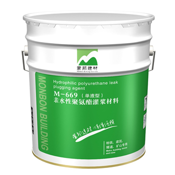 M-669单液型亲水性聚氨酯灌浆材料由亲水性聚醚多元醇与异氰酸酯反应而成的末端含有异氰酸根基因的一种新型的化学灌浆材料。属低溶剂结构弹性胶体,单液型亲水性聚氨酯灌浆材料与水作用后,迅速膨胀凝固堵塞其裂缝,达到止水的目的;亦可与少量催化剂配合使用,依照实际施工需求来调整反应速度,以达到完美的防水堵漏效果。
